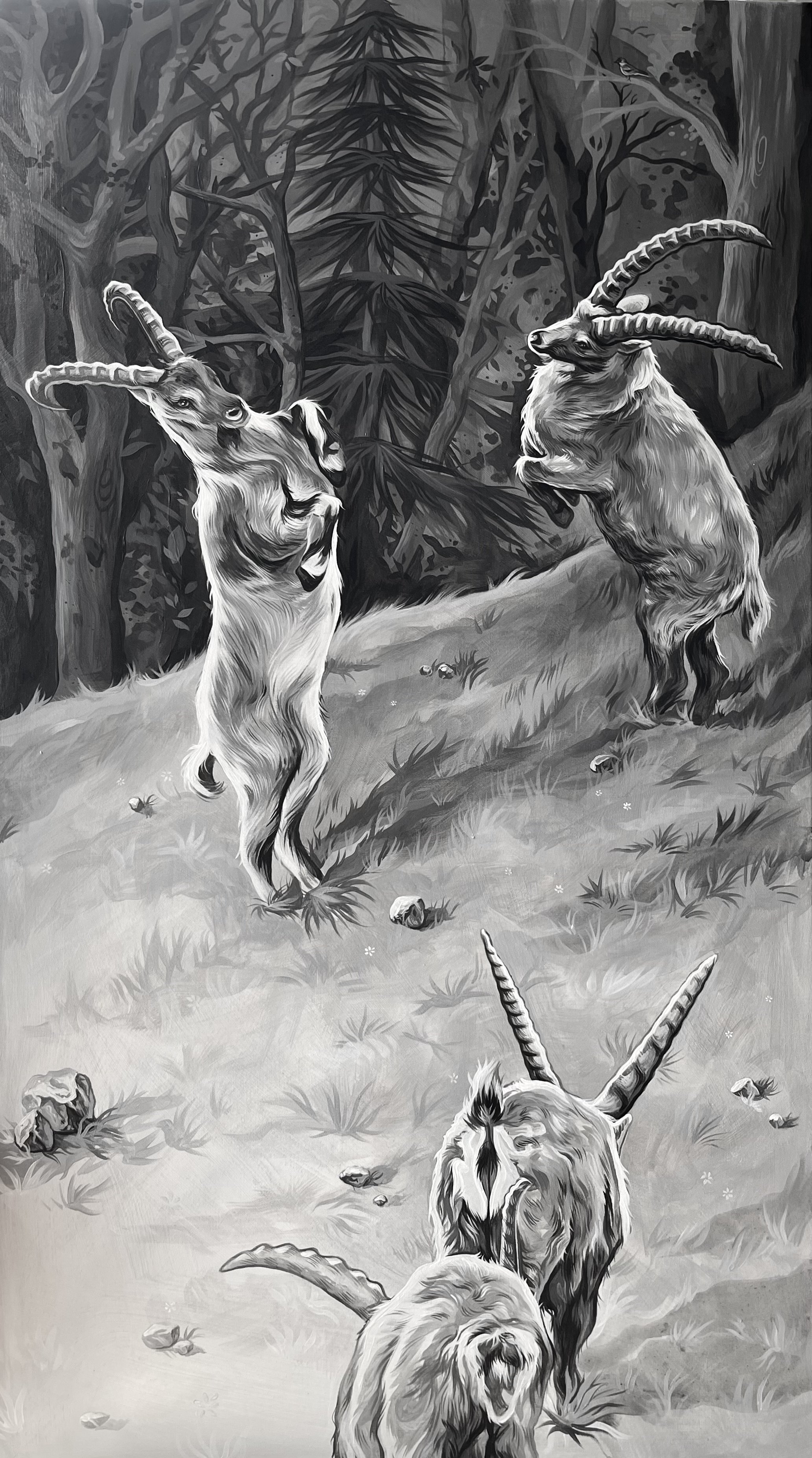 Diese zweiteilige Serie von Steinböcken entstand als Auftragsarbeit und wurde als Acrylgemälde auf Leinwand umgesetzt. Als Referenz dienten Fotografien der Tiere, die zur Verfügung gestellt wurden. Auf dieser Grundlage entwickelte ich in Absprache mit der Auftraggeberin die Bildhintergründe und stellte die vollständigen Vorlagen für die malerische Umsetzung eigenständig zusammen.